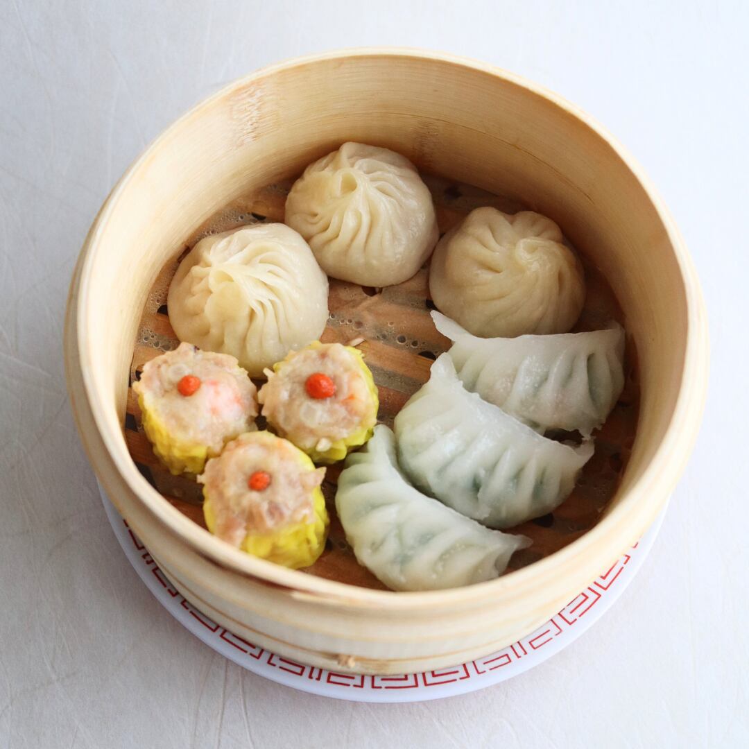 国産の粗挽き肉とエビ・玉葱・椎茸の具材を黄皮で包み、クコの実をのせた彩りの良い焼売です。